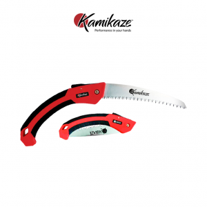 Serrucho plegable de hoja curva de 180 mm. Mango de plástico revestido en goma que hace el trabajo muy cómodo para la mano incluso sin utilización de guantes.